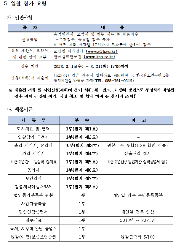 [공고] 진주실크소재 디지털 플랫폼 구축을 위한 로드맵 및 분류체계 개발 용역 수행업체 입찰 재공고 글번호59 작성자관리자 작성일2023년 03월 16일 09시 52분 조회수273 입찰공고문(재공고).hwp 붙임1-용역과업지시서(재공고).hwp 붙임2-별지서식(재공고).hwp